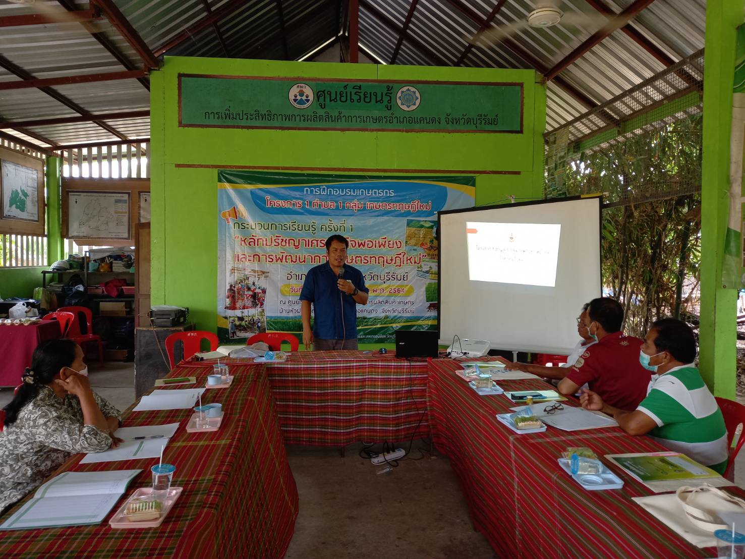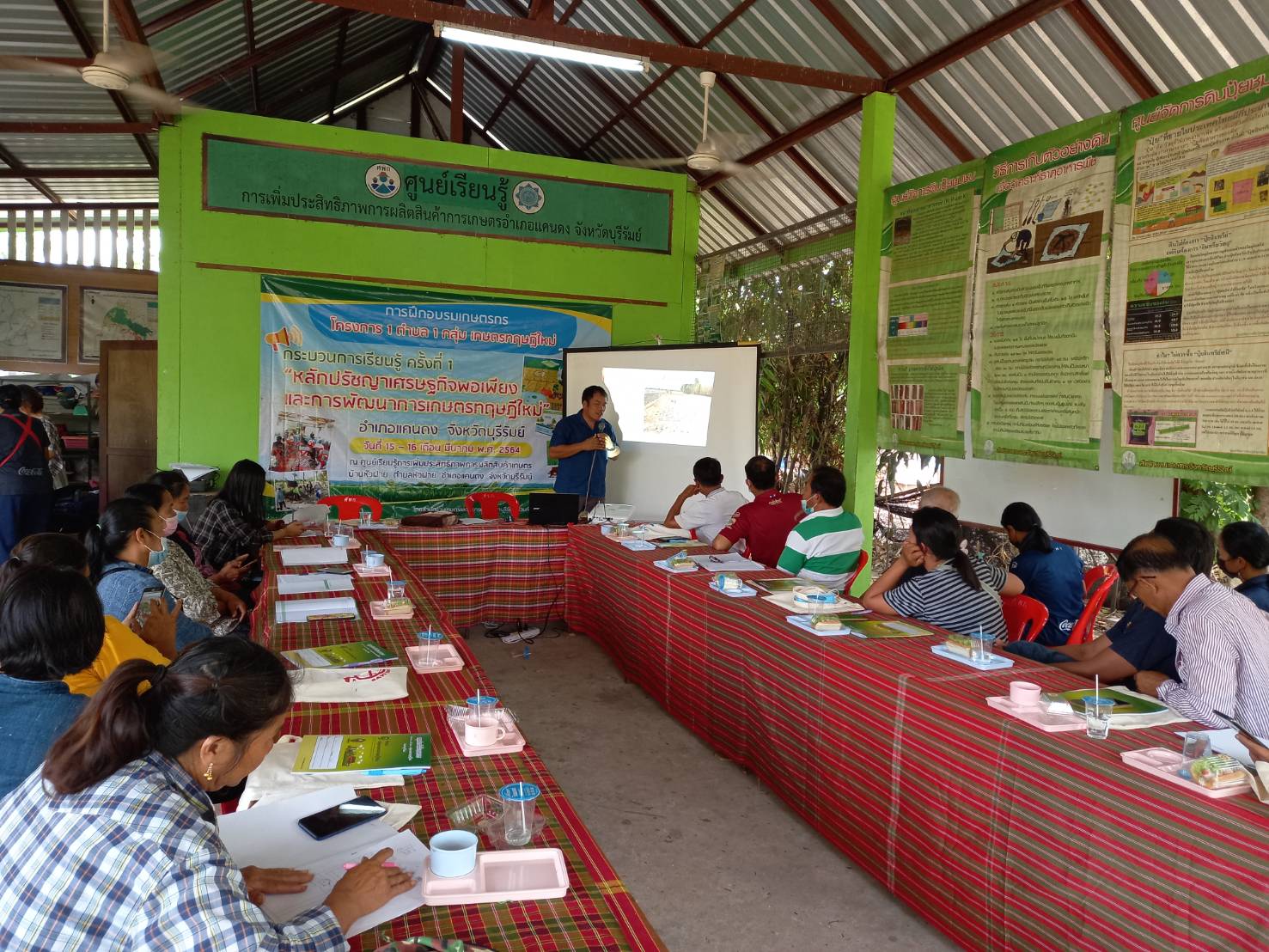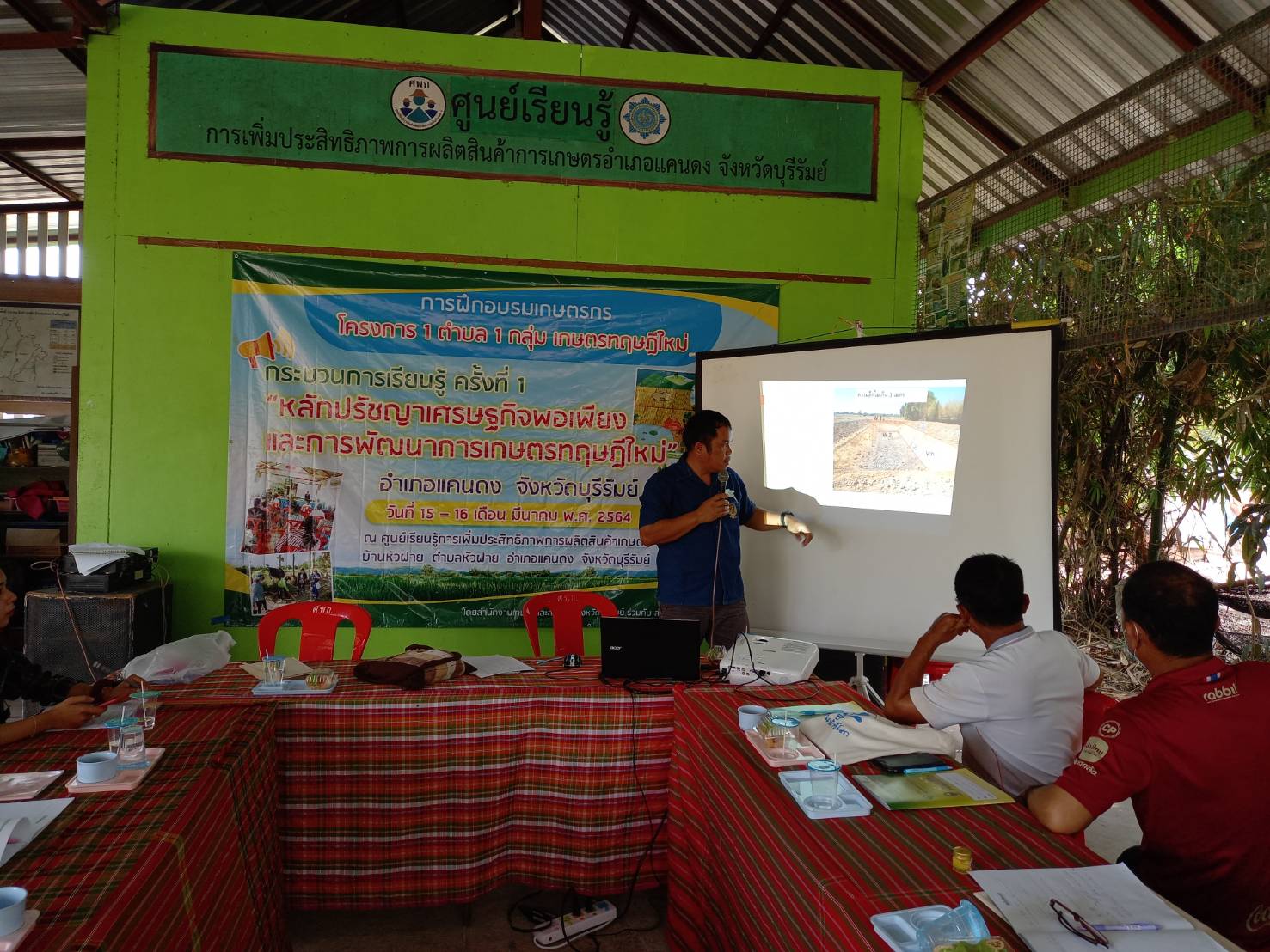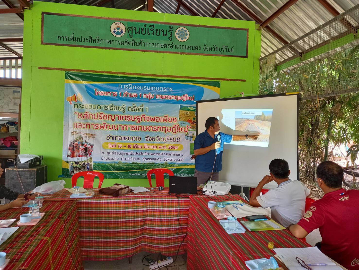 วันที่ 16 มีนาคม 2564 สถานีพัฒนาที่ดินบุรีรัมย์ ลงพื้นที่เพื่อเป็นวิทยากรในการอบรมเกษตรกรภายใต้โครงการ 1 ตำบล 1 กลุ่มเกษตรทฤษฎีใหม่ บรรยายหัวข้อ แนวคิด หลักการ และรูปแบบของเกษตรทฤษฎีใหม่ : การบริหารจัดการน้ำด้วยระบบและวิธีการที่เป็นมิตรต่อสิ่งแวดล้อม และการเตรียมความพร้อมเกษตรกร/จ้างงานระดับตำบลกิจกรรมการพัฒนาพื้นที่ (การขุดสระน้ำ)/การคำนวณปริมาณคิวดิน ให้แก่เกษตรกรที่เข้าร่วมโครงการฯ เพื่อเสริมสร้างความรู้ความเข้าใจของหลักปรัชญาของเศรษฐกิจพอเพียงมาประยุกต์ใช้ในการพัฒนาการเกษตรของตนได้ จำนวน 15 ราย และจ้างงาน จำนวน 6 ราย ของตำบลหัวฝาย อำเภอแคนดง จังหวัดบุรีรัมย์ ณ ศูนย์เรียนรู้การเพิ่มประสิทธิภาพการผลิตสินค้าเกษตร (ศพก.) ตำบลหัวฝาย อำเภอแคนดง จังหวัดบุรีรัมย์