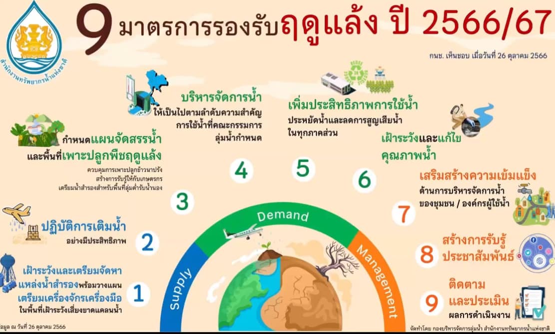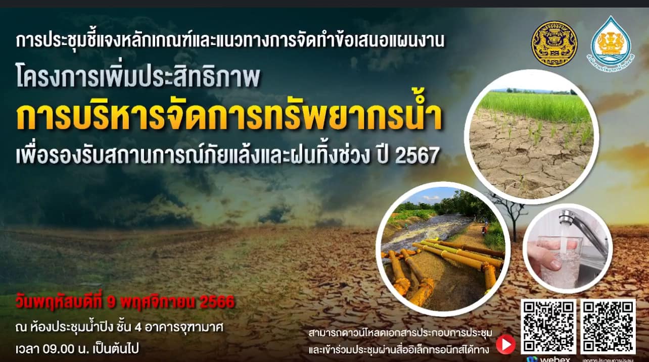 วันที่ 9 พฤศจิกายน 2566 นายเกรียงไกร ไชยโพธิ์ ผู้อำนวยการสถานีพัฒนาที่ดินบุรีรัมย์ การประชุมชี้แจงหลักเกณฑ์และแนวทางการจัดทำข้อเสนอแผนงานโครงการเพิ่มประสิทธิภาร การบริหารจัดการทรัพยากรน้ำ เพื่อรองรับสถานการณ์ภัยแล้งและฝนทิ้งช่วงปี 2567 ผ่านช่องทางการสื่อสารออนไลน์ Facebook Live โดยสำนักงานทรัพยากรน้ำแห่งชาติ ณ ห้องประชุมสถานีพัฒนาที่ดินบุรีรัมย์ โดยมี ดร.สุรสีห์ กิตติมณฑล เลขาธิการสำนักงานทรัพยากรน้ำแห่งชาติ เป็นประธานในการประชุม วัตถุประสงค์ เพื่อทราบมติคณะกรรมการทรัพยากรน้ำแห่งชาติ ครั้งที่ 2/2566 เมื่อวันที่ 26 ตุลาคม 2566 เห็นชอบมาตรการรองรับฤดูแล้ง ปี 2566/2567 และโครงการเพิ่มประสิทธิภาพการบริหารจัดการทรัพยากรน้ำเพื่อรองรับสถานการณภัยแลงและฝนทิ้งช่วง ปี 2567 พร้อมหลักเกณฑ์และแนวทางการจัดทำ ข้อเสนอแผนงานโครงการ เพิ่มประสิทธิภาพการบริหารจัดการทรัพยากรน้ำเพื่อรองรับสถานการณ์ ภัยแล้งและฝนทิ้งช่วง ปี 2567 เพื่อให้การดำเนินงานกับหน่วยงานที่เกี่ยวข้องบรรลุเป้าหมายตรงตามวัตถุประสงค์ และเกิดผลสำเร็จอย่างมีประสิทธิภาพ